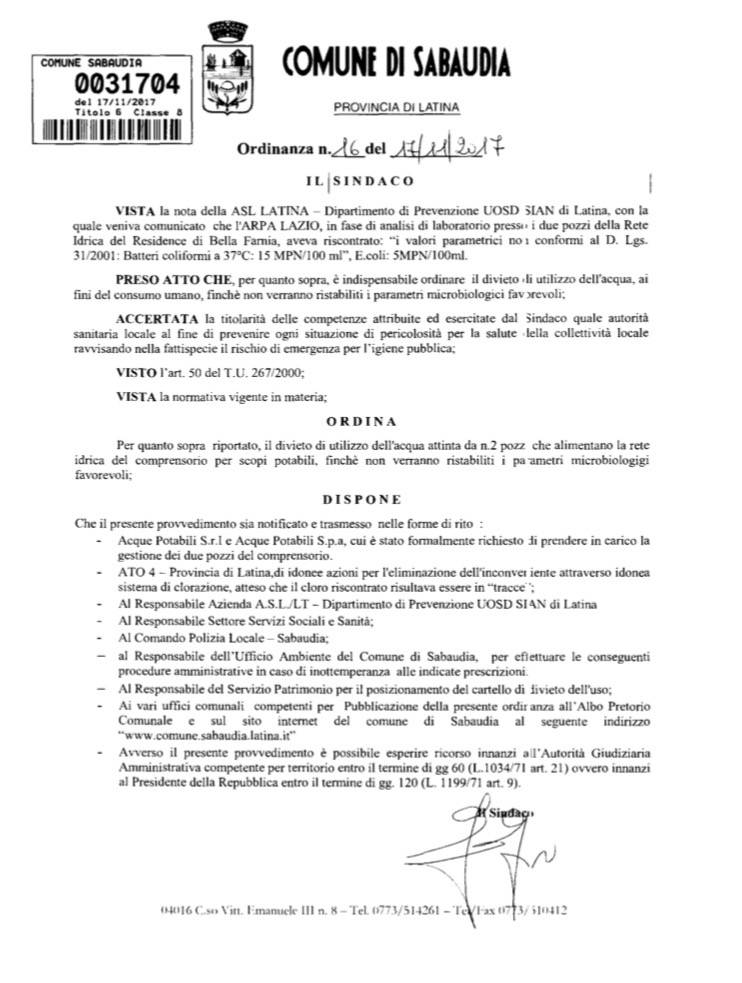 Il residence, almeno leggendo l’ordinanza sindacale numero 16 del 17 novembre 2017, sembra non sia servito da acqua potabile. Sull’ordinanza venne messo nero su bianco il divieto dell’uso dell’acqua ai fini del consumo umano a causa di batteri E-Coli. Scorrendo oggi sull’Albo Pretorio del comune di Sabaudia non risulta una revoca dell’ordinanza. Viene da chiedersi cosa sia stato fatto da novembre del 2017 per cercare di ristabilire i parametri microbiologici favorevoli. Alla luce dei fatti pare che le scarse condizioni igieniche sanitarie, insieme al degrado totale (addirittura quadri elettrici con fili scoperti) renderebbero il residence inagibile.