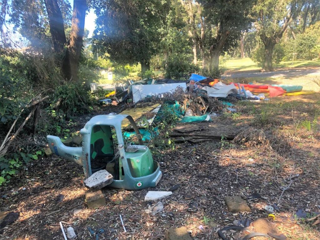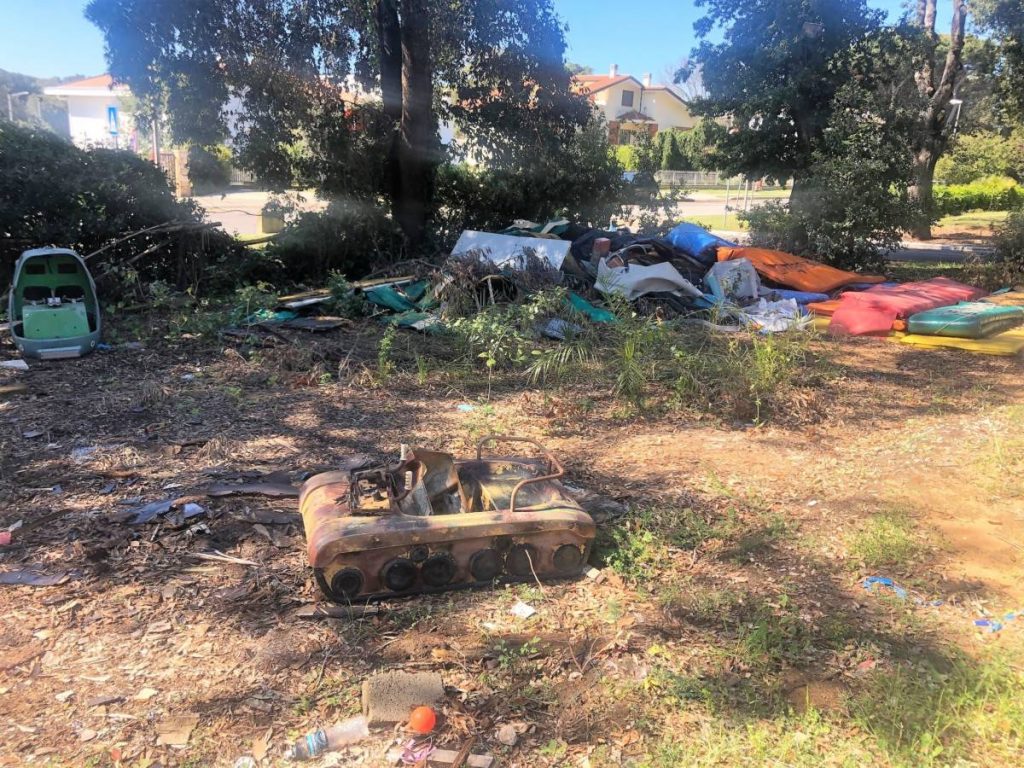 Altro che campo profughi! I giardinetti pubblici situati nel ‘triangolo’ di via Dante, via Caracciolo e via Principe Eugenio, in pieno centro a Sabaudia, sono uno scandalo. Una vergogna senza fine. Come si vede dalle numerose foto (scattate questa mattina, ndr) quell’area che qualche anno fa era il ritrovo dei bambini, dove potevano saltare e divertirsi, ora è diventata una vera e propria discarica a cielo aperto. Materassi dismessi, secchi dell’immondizia abbandonati, scarpe, bottiglie di vetro e di plastica, buste nere con rifiuti, giochi dismessi. Chi più ne ha più ne metta. Tutto accantonato ad un angolo, dietro una siepe, quasi per non far vedere. La sporcizia si pulisce, non si nasconde.