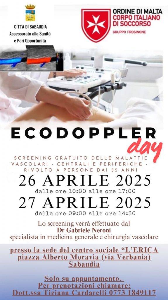 L’Assessorato alla Sanità e Pari Opportunità del comune di Sabaudia, in collaborazione con l’Ordine di Malta – Corpo Italiano di Soccorso (Sezione di Frosinone), organizza due giorni di screening gratuiti per la salute della comunità. Le visite si terranno al Centro Anziani L’Erica, in via Verbania a Sabaudia nei giorni sabato 26 aprile dalle dalle 10:00 alle 17:00, e domenica 27 aprile, dalle 9:00 alle 14:30. L’accesso è solo su prenotazione. I cittadini interessati possono chiamare il numero 0773/1849117 per riservare il proprio appuntamento.