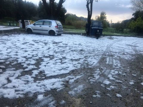 Folle primavera, oggi pomeriggio Sabaudia è stata sommersa dalla grandine. Mezzora di maltempo e tutto si è imbiancato: strade, prati…